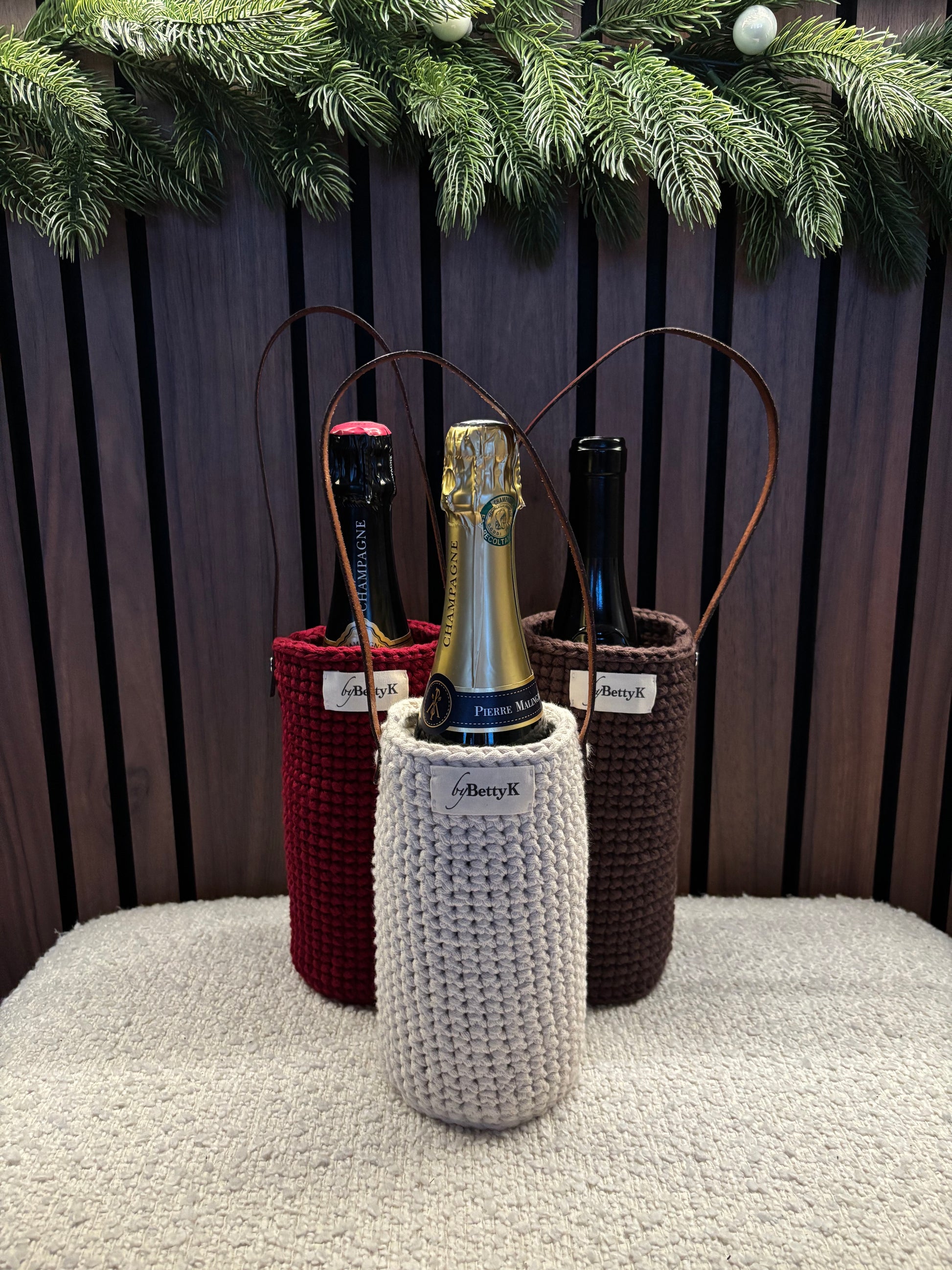 Handvirkad i kraftigt garn som ger stadga och skyddar flaskan.
